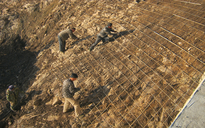 (图为黄泥沟项目挂网喷播混凝土现场)