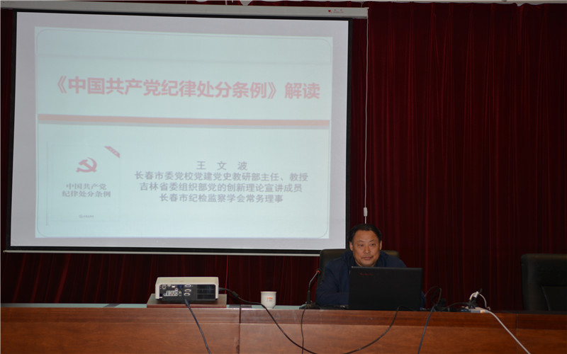 为加深全所党员对《中国共产党纪律处分条例》的理解和领会,10月10日下午,所党委特邀长春市委党校党建党史研究部主任王文波教授来我所讲授《解放思想 强化担当 把党规党纪刻印在全体党员干部心上》党课。王文波教授对新修订的《中国共产党纪律处分条例》进行了全面解读,从《条例》修订的时代背景、主要内容以及贯彻落实讲起。对我党为什么再次修订《条例》、修订后的新增条款及修改条款进行了重点解读。这次修订《条例》,紧紧围绕党中央和习近平总书记关于加强新时代党的建设总要求,把政治建设摆在首位,把坚决维护以习近平同志为核心的党中央权威和集中统一领导作为出发点和落脚点,在总体要求上增加党组织和党员牢固树立“四个意识”的规定,进一步扎紧依规管党治党的制度笼子。新修订的《条例》共142条,与原条例相比,新增11条,修改65条,整合了2条,自2018年10月1日起施行。