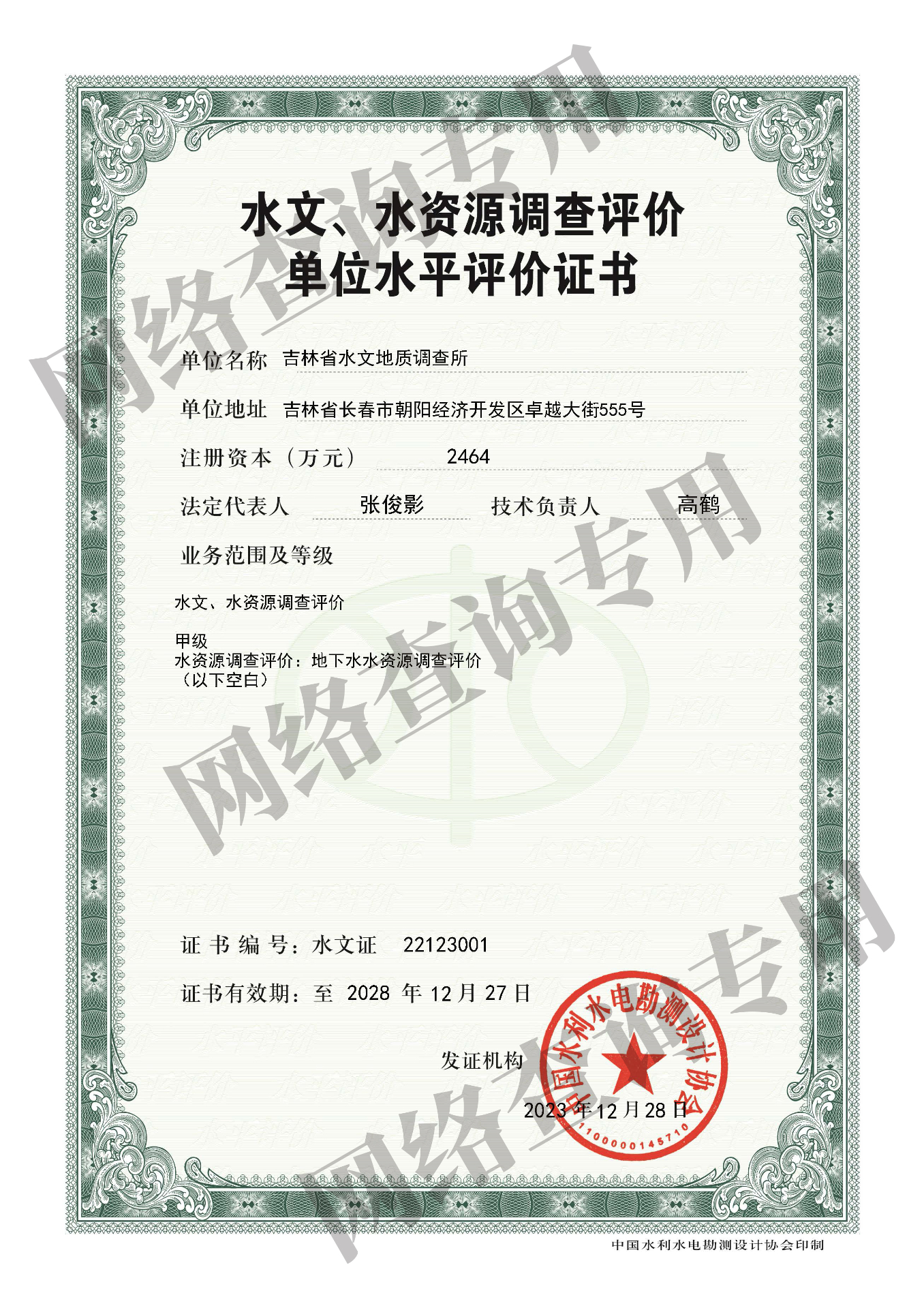 水文、水资源调查评价单位水平评价证书