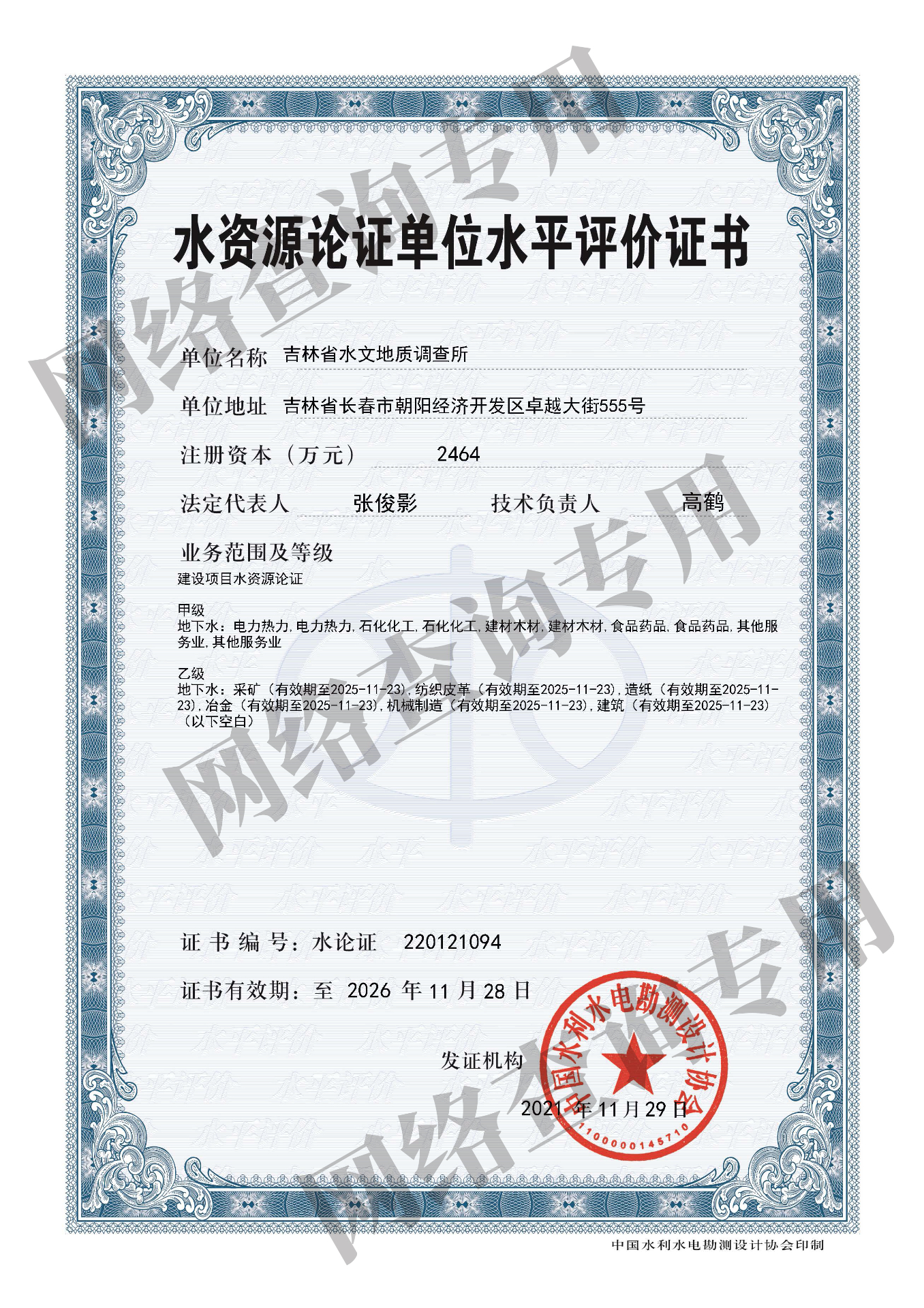 水资源论证单位水平评测证书