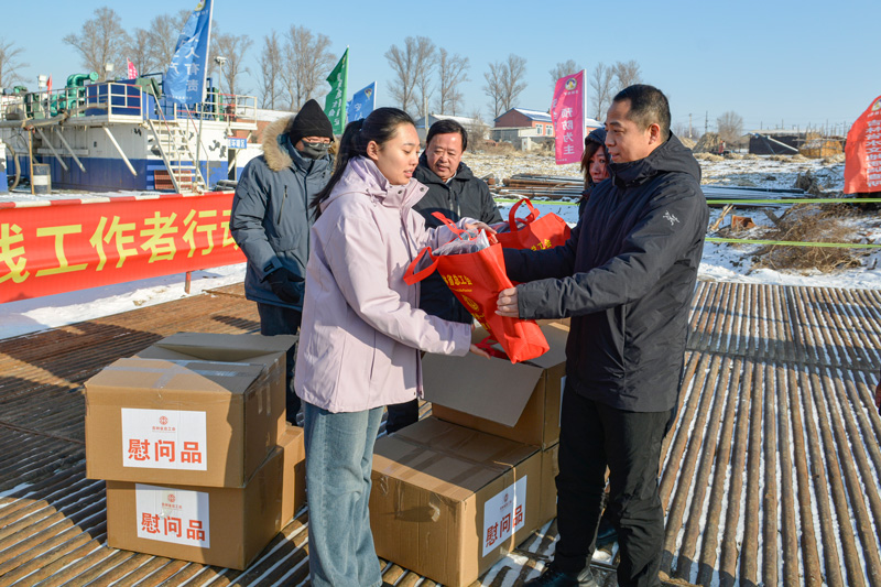 柴运龙一行分别察看了项目工作场所、党员学习室、工会活动室、工人宿舍、食堂等,现场为一线工人发放了保暖卫衣,把党和政府的关怀送到了野外一线工作者的心坎上。